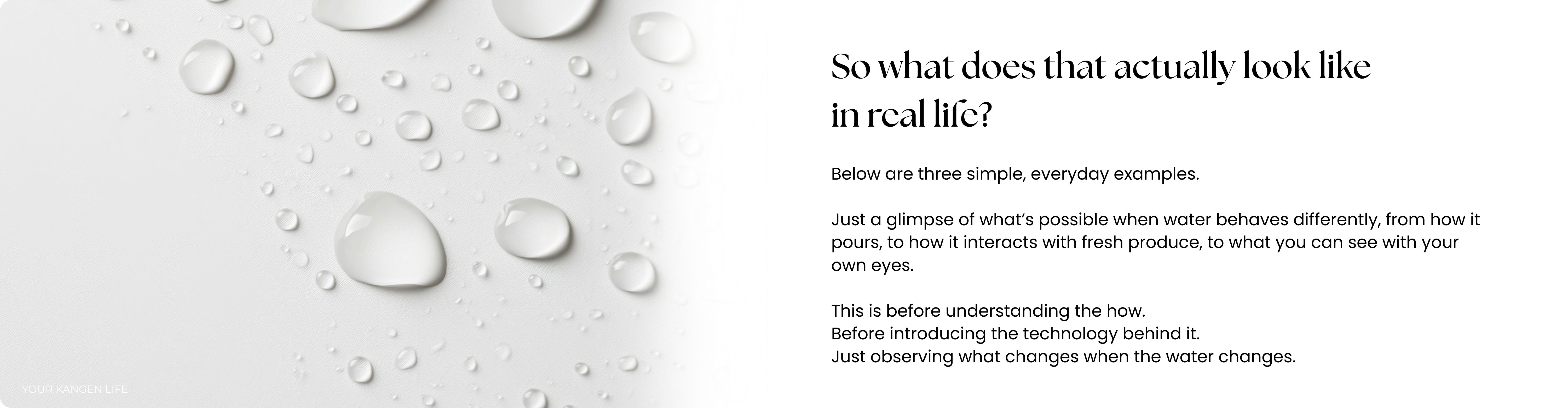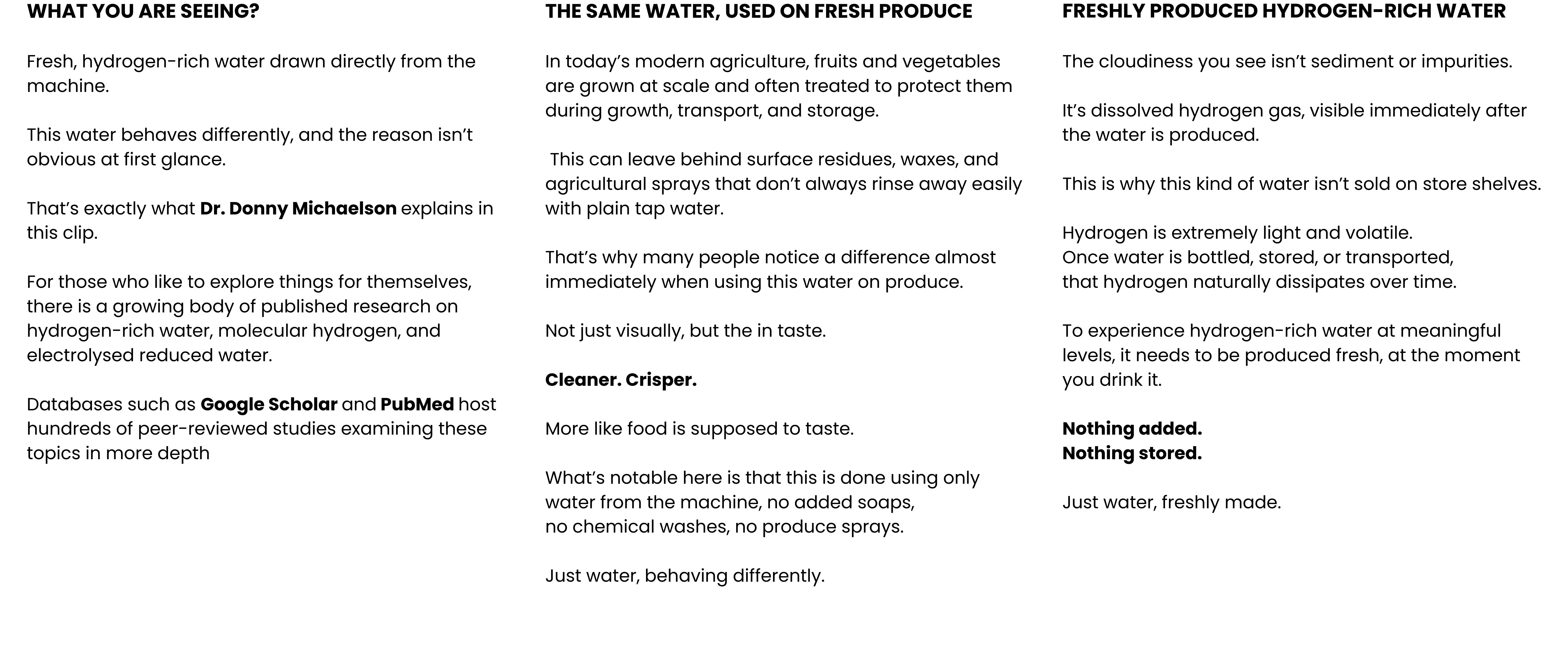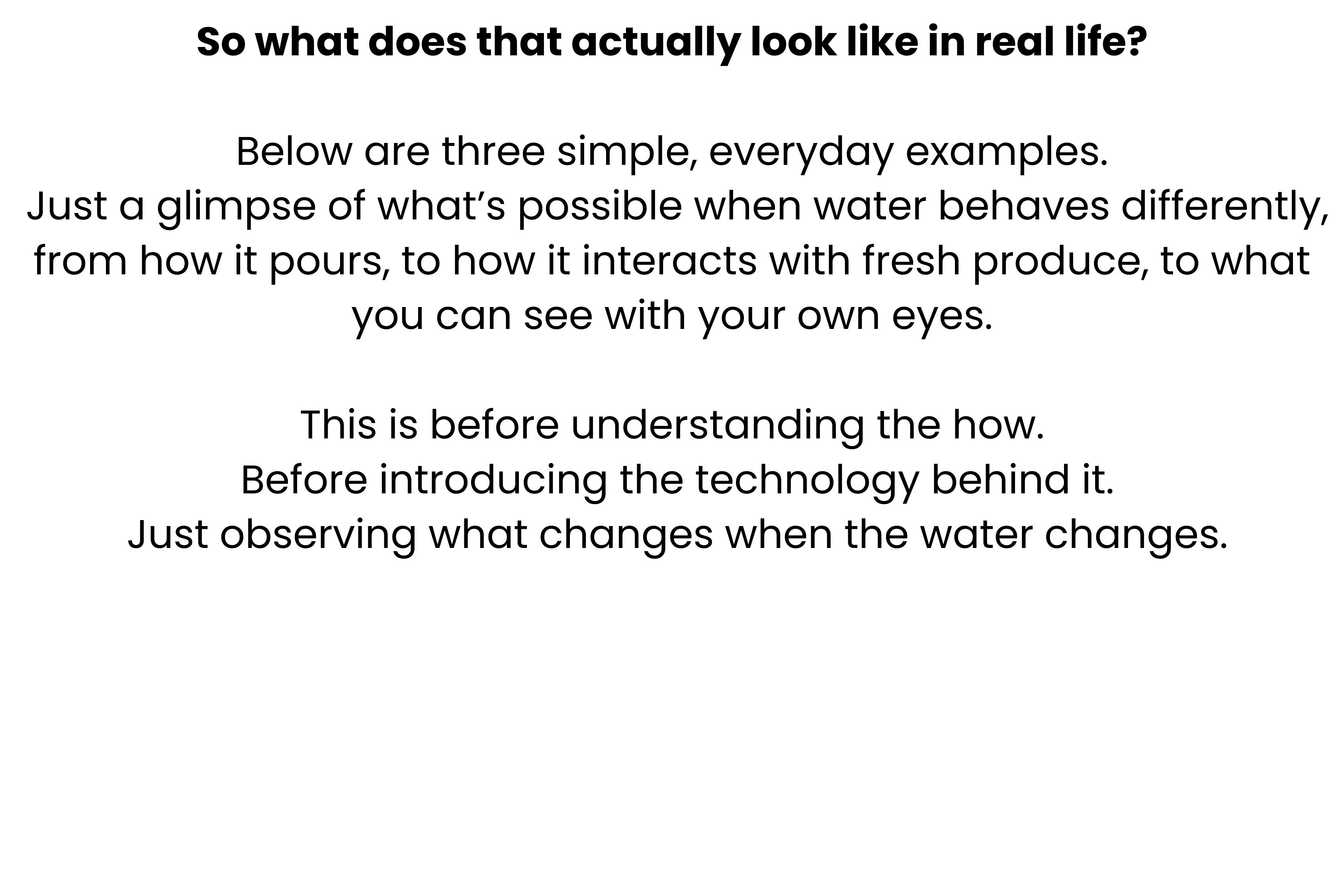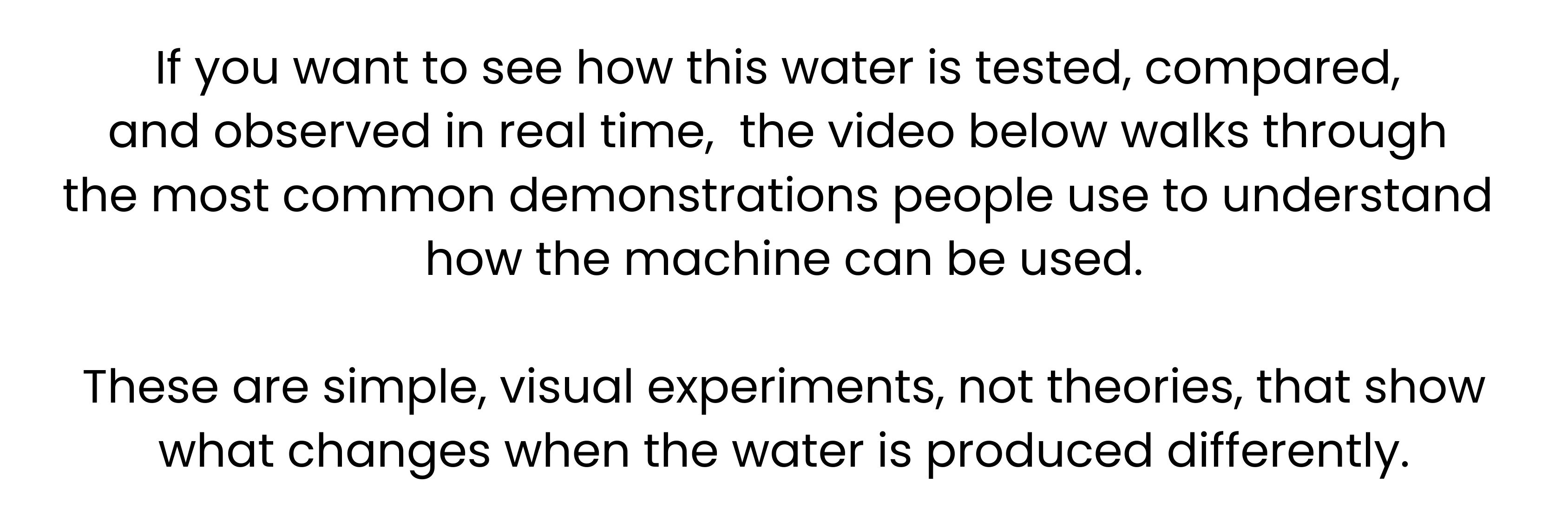 These are simple, visual experiments, not theories, that show what changes when the water is produced differently.