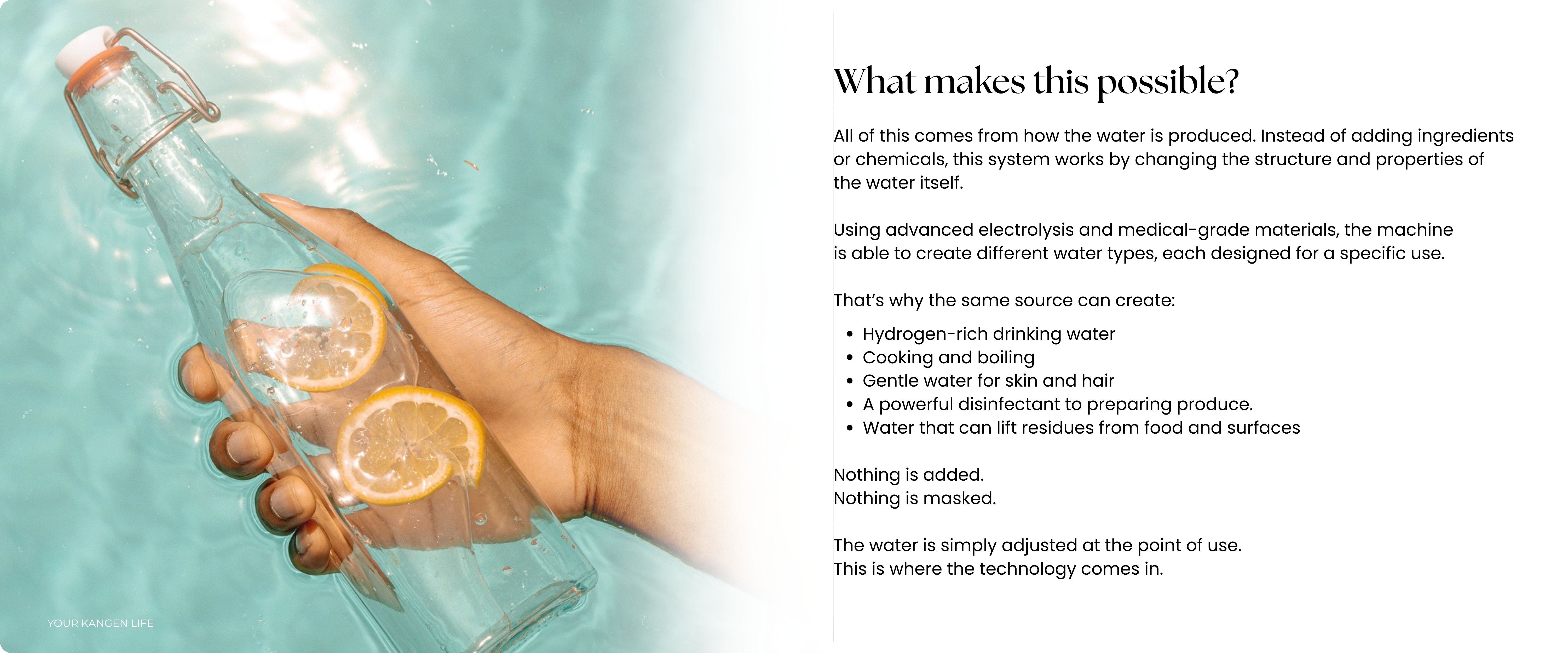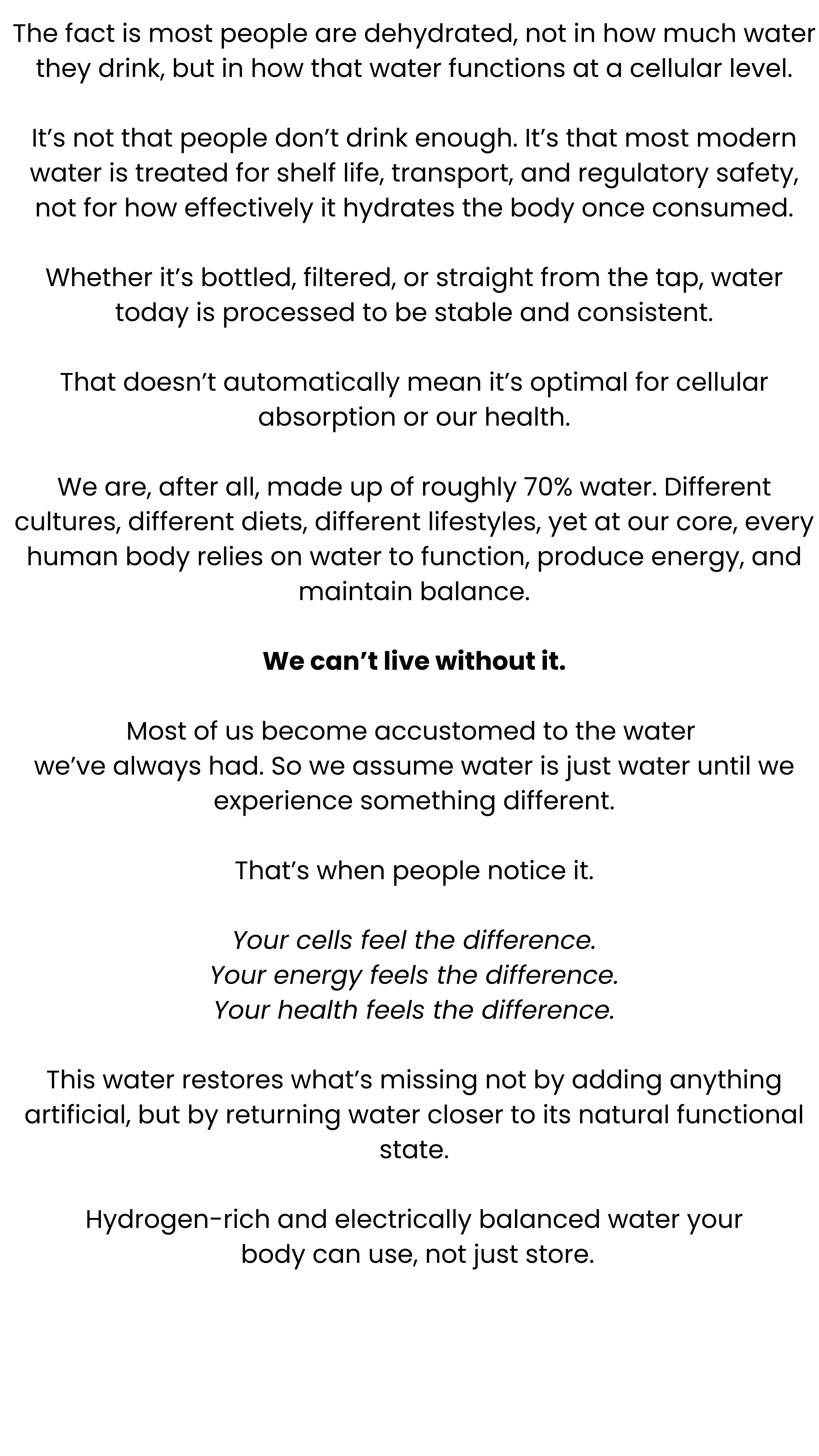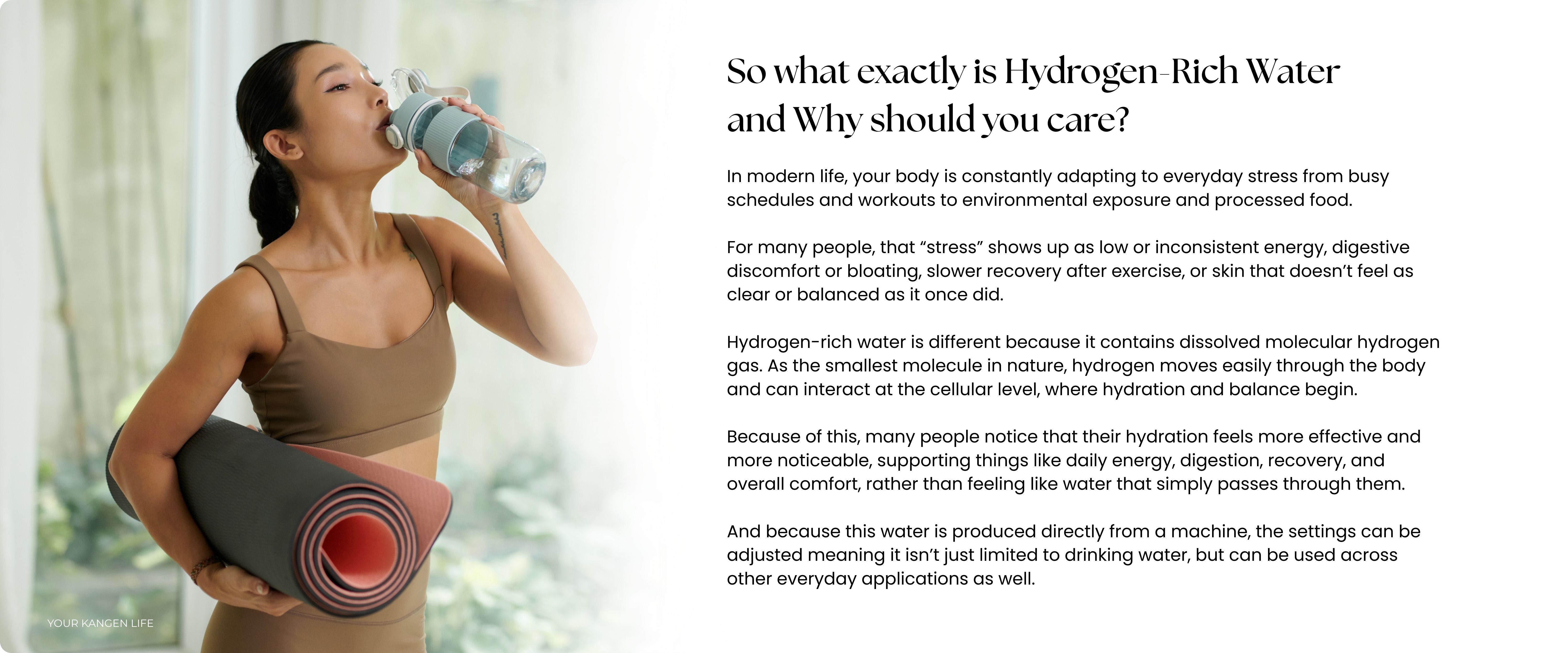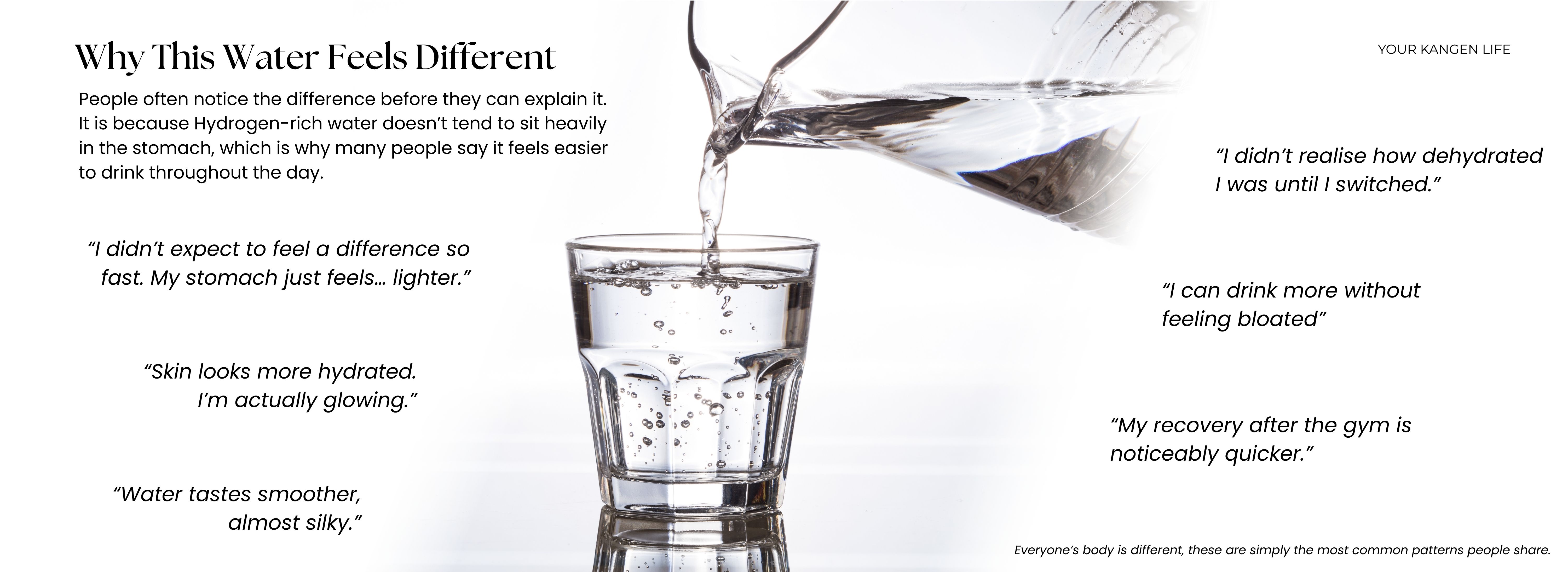No. Supplements, mineral drops, or dissolvable tablets work by adding minerals to the water. The K8 works completely differently, it uses electrolysis to dissolve molecular hydrogen (H₂) into the water. That’s what creates the smoother texture, easier hydration, and light-on-the-stomach feel people notice. Tablets and drops can’t generate hydrogen, so the experience isn’t the same.