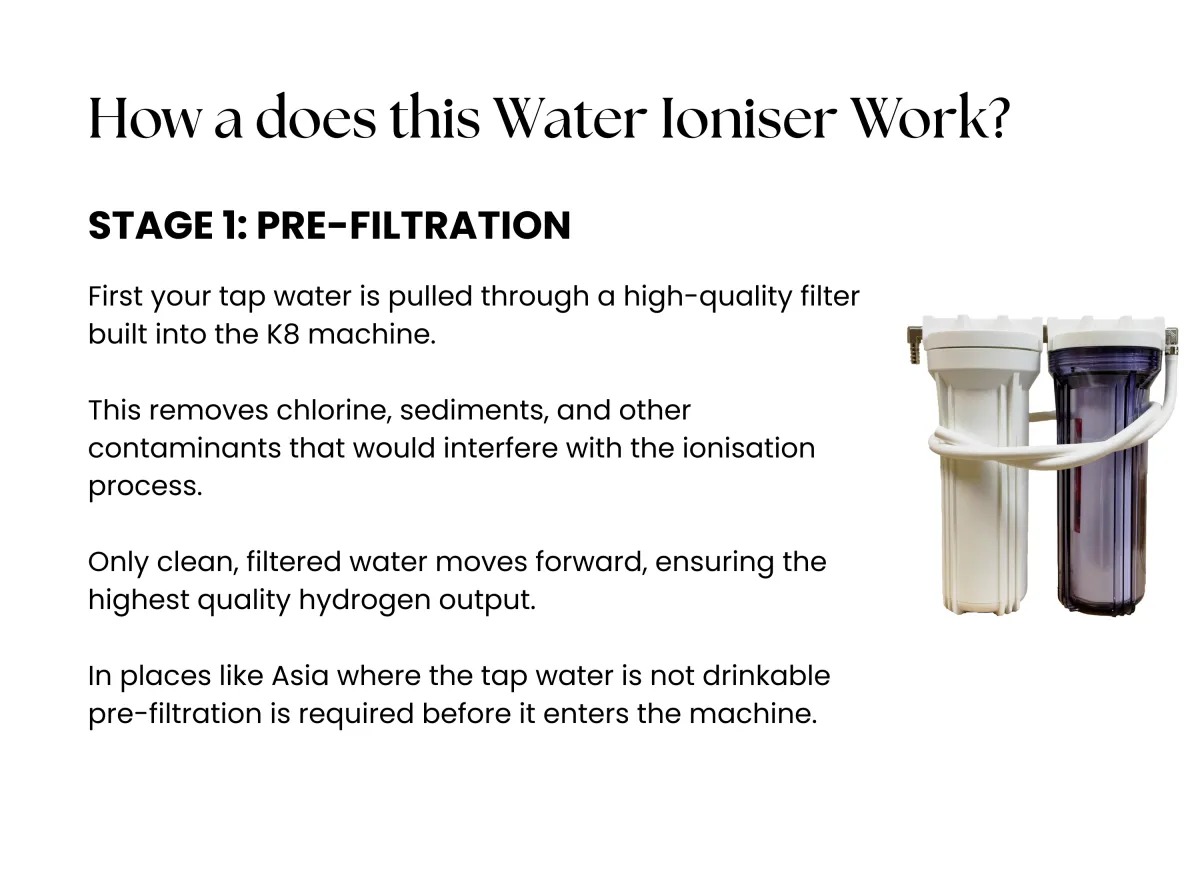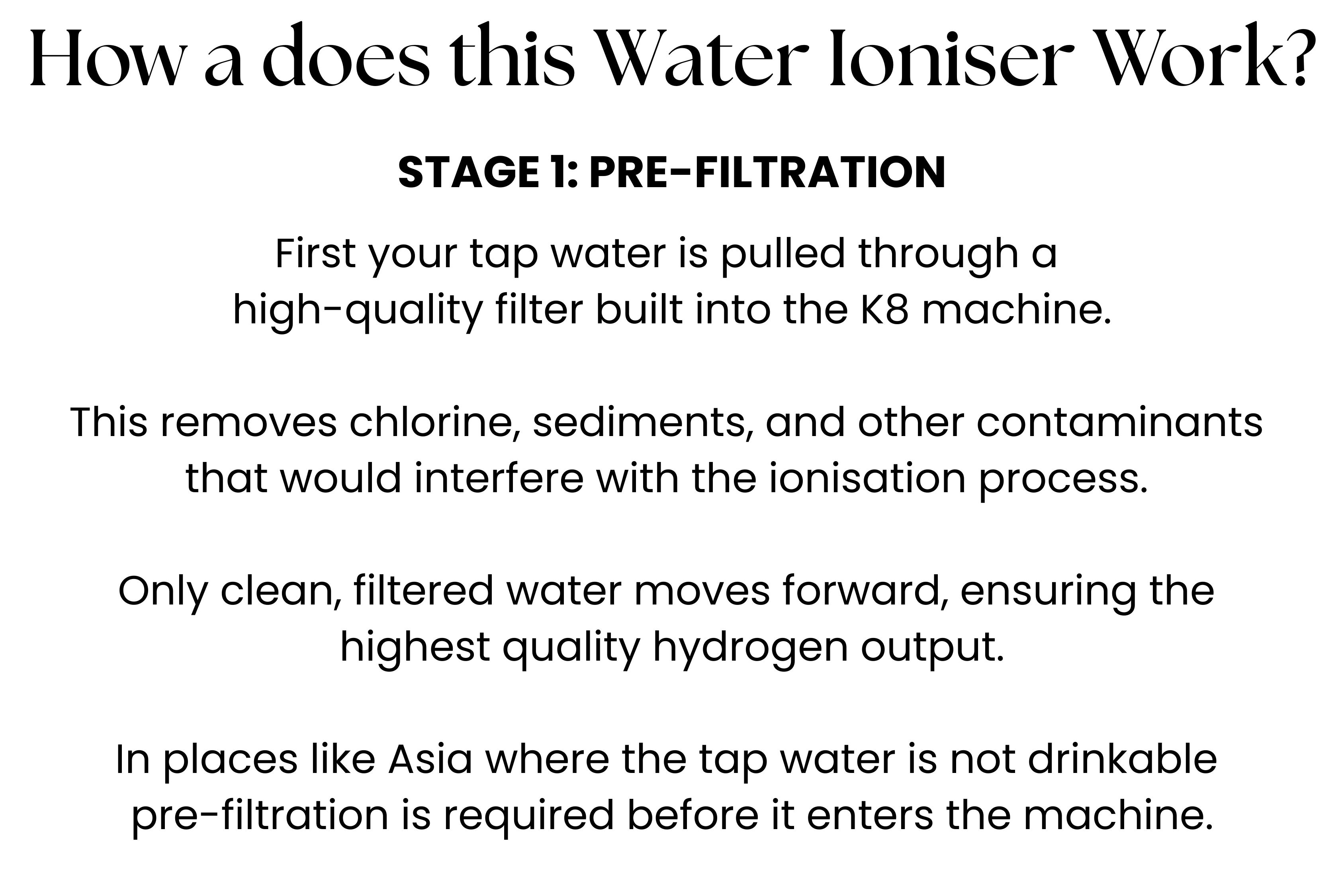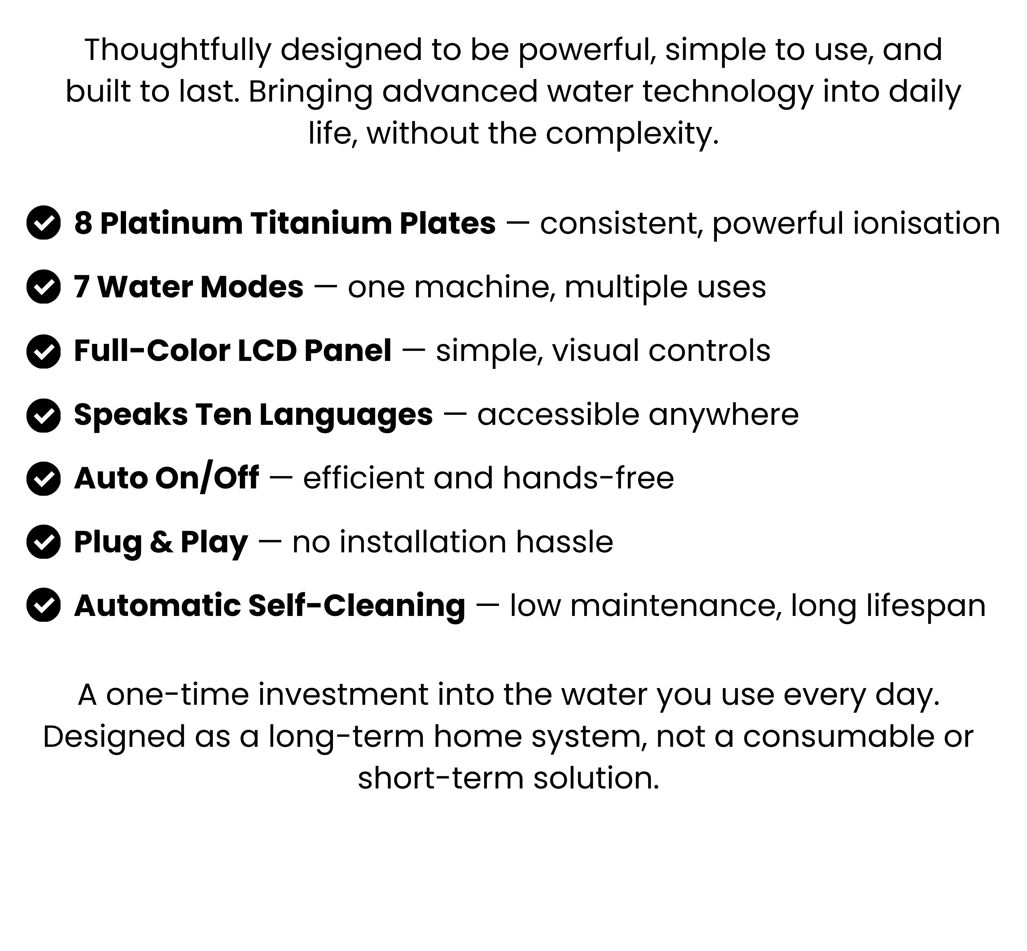 The K8 Water Ioniser creates the water fresh, on demand, using electrolysis, so you’re drinking it while the hydrogen is still active. That’s why people feel the difference so quickly: it’s not about pH hype or the additives, it’s the presence of dissolved hydrogen right when you drink it.