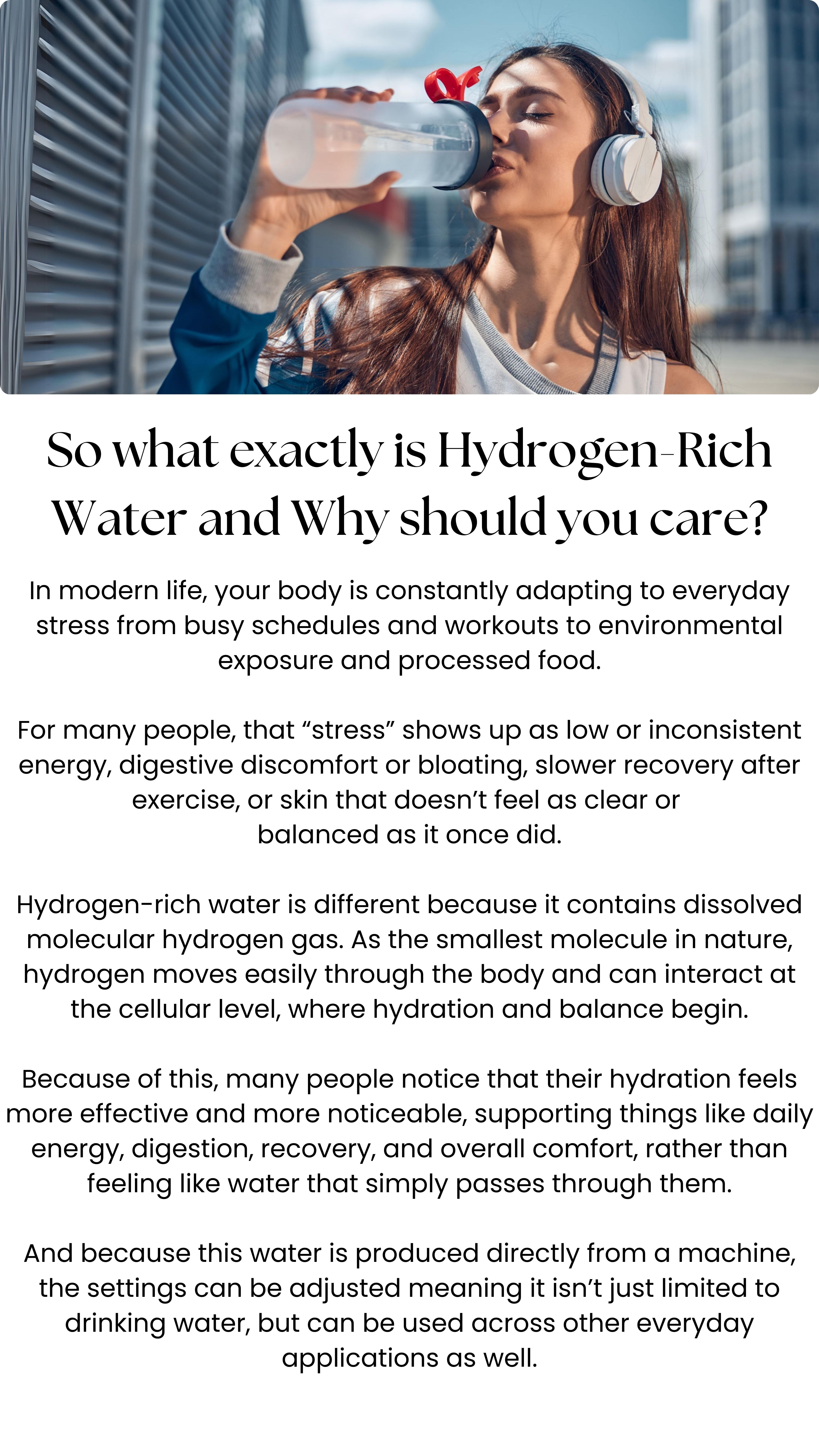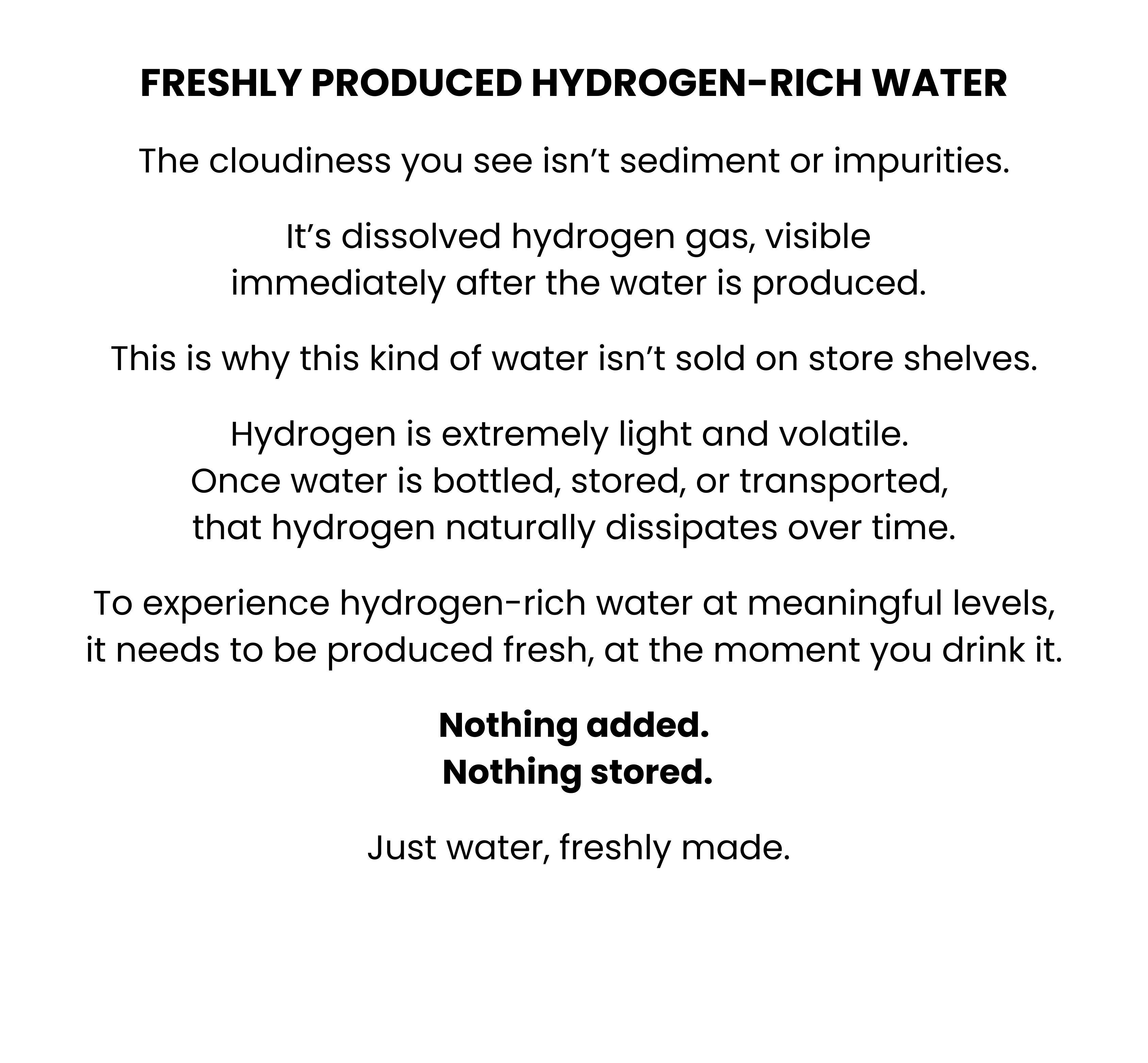 Dissolved hydrogen begins diffusing out immediately. In an open glass, it starts to escape within minutes which is why drinking it fresh gives you the highest benefit. A sealed stainless-steel or glass bottle can slow the loss to a few hours, but it can’t ‘hold’ hydrogen long-term. It’s also why you don’t see true hydrogen-rich water on supermarket shelves, hydrogen is naturally short-lived, like any fresh nutrient it's most potent when it’s just made.