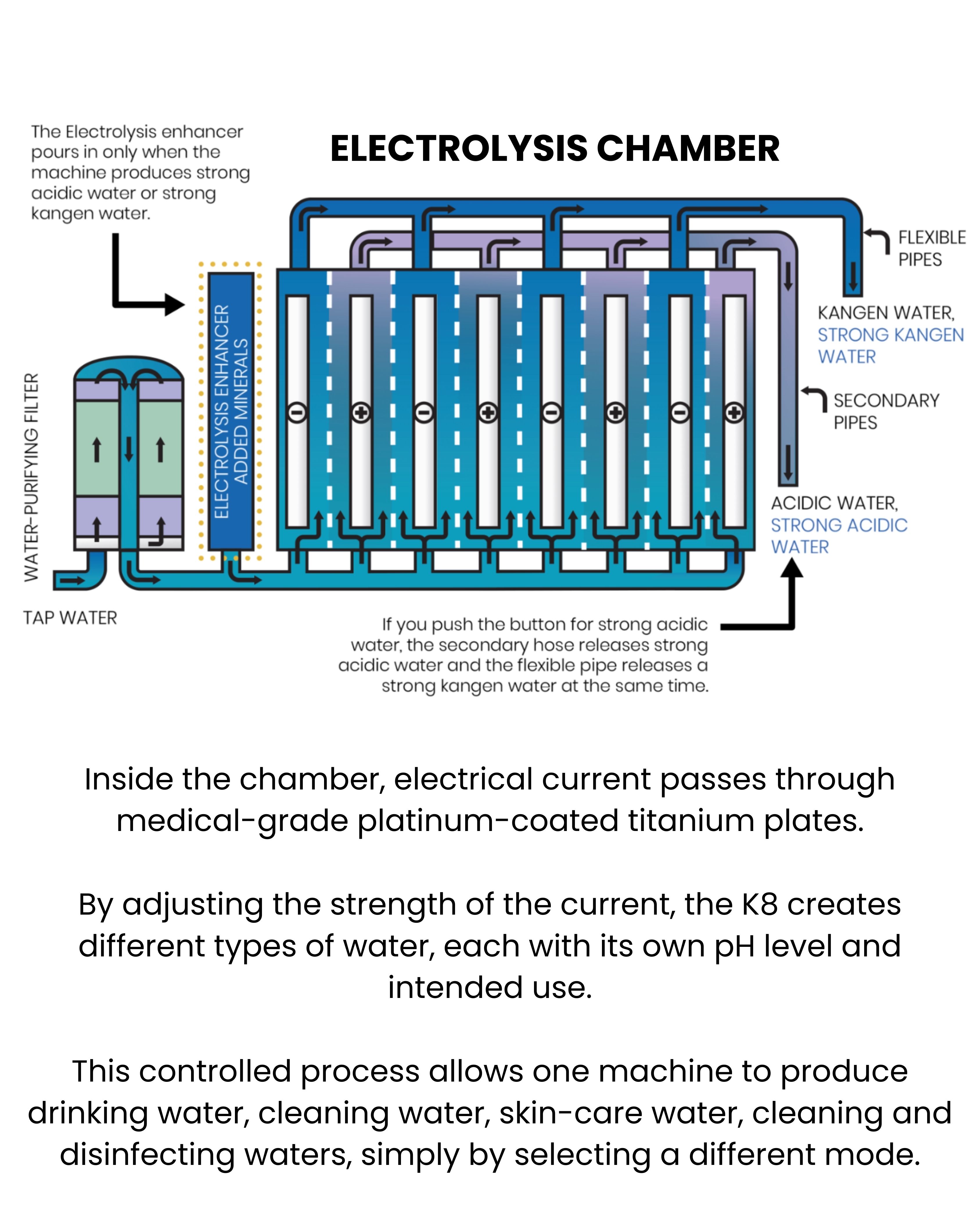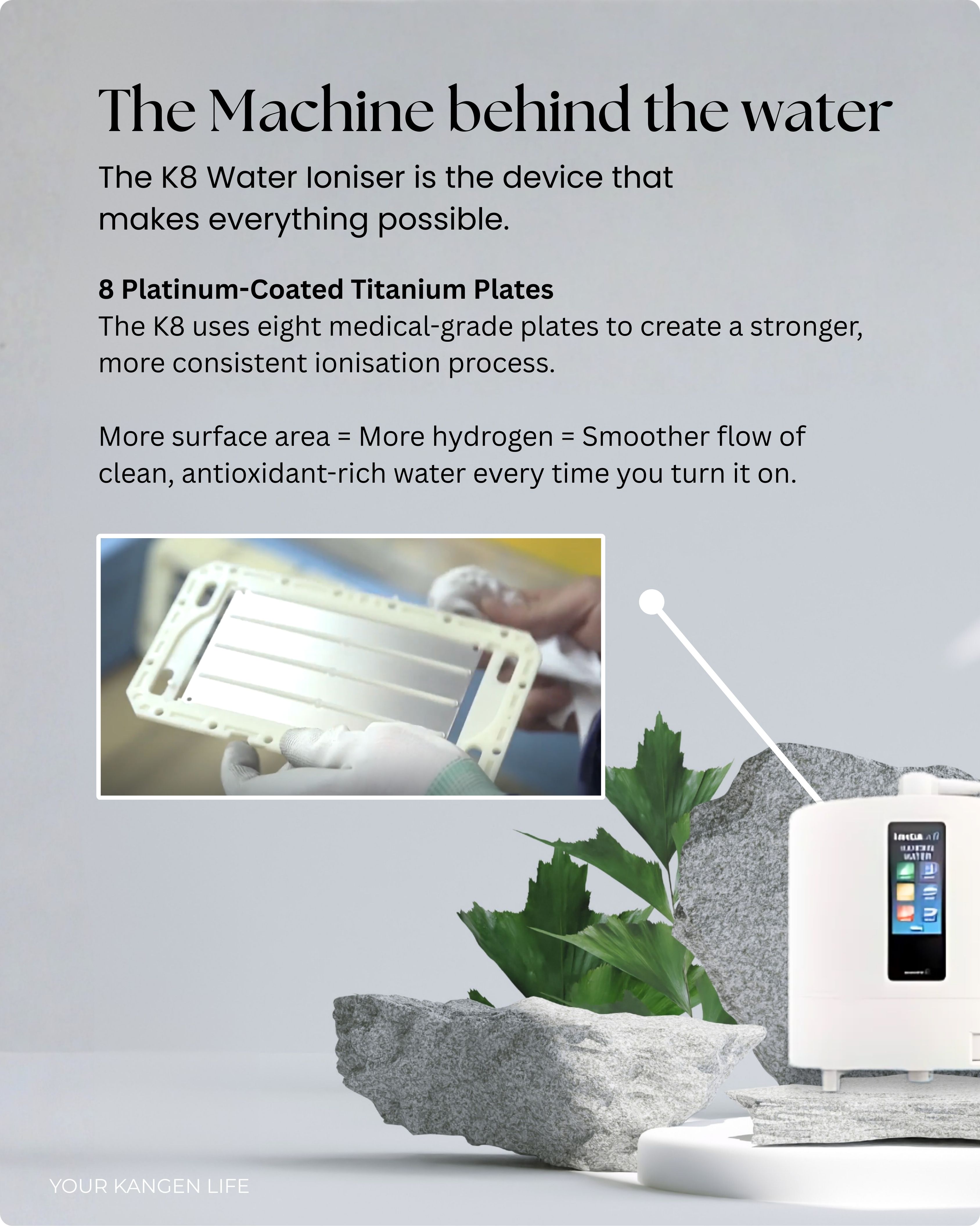 The K8 Water Ioniser creates the water fresh, on demand, using electrolysis, so you’re drinking it while the hydrogen is still active. That’s why people feel the difference so quickly: it’s not about pH hype or the additives, it’s the presence of dissolved hydrogen right when you drink it.